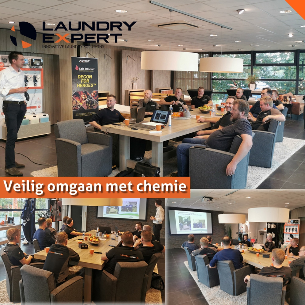 Laundry Total is altijd in ontwikkeling. Zo hebben onze toppers van techniek deze maand de cursus 'Veilig omgaan met chemie' gevolgt en met succes het certificaat behaald! Met dank aan onze partner Christeyns, voor het geven van de cursus.