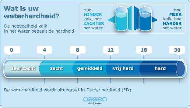 De term ‘hardheid van water’ slaat op de hoeveelheid opgeloste calcium- en magnesiumzouten in water. Om de hardheid van water uit te drukken wordt de Franse graad (°F) of de Duitse graad (°D) gebruikt. Hard water bevat veel Calcium en Magnesium. Calcium en Magnesium zijn echter onontbeerlijk voor onze gezondheid. In hard water wordt veel van de zeep gebruikt om het water zachter te maken in plaats van het reinigen van de kleding.