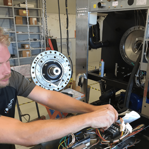 - De machine wordt aangesloten op onze testbank in onze technische werkplaats.
